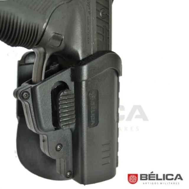 Possui trava de segurança, que pode ser liberada no exato momento do saque da arma.
