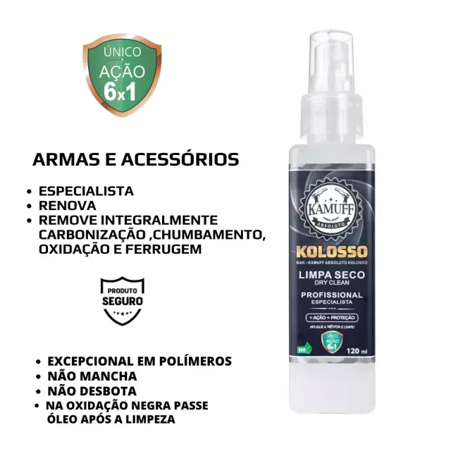 Rápido e solução integral na limpeza de armas e equipamentos. Produto seguro. O primeiro limpador a seco ecológico para armas. Único 6x 1 do mercado - limpa, desengordura, desengraxa, descarboniza, higieniza e dá brilho em operação instantânea e simultânea. Tem ainda ação sobre odores, oxidação e ferrugem. Conceito: APLIQUE A NÉVOA E LIMPE ATÉ SECAR. Use escova macia se desejar. Faz remoção de chumbamento do cano inclusive de arma longa. Produto a base d'água (na oxidação negra deve-se deixar integralmente seca). "Água é melhor limpador do planeta". Pode ser aplicado em quaisquer materiais ou ambiente ou ambiente, pois não libera gases, tendo efeito positivo na manutenção da saúde no médio e longo-prazos.